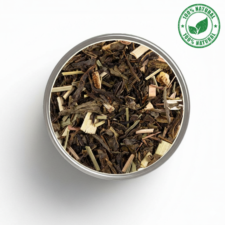 Thé vert China Sencha décaféiné, citronnelle, écorces de citron (12%), arôme naturel.